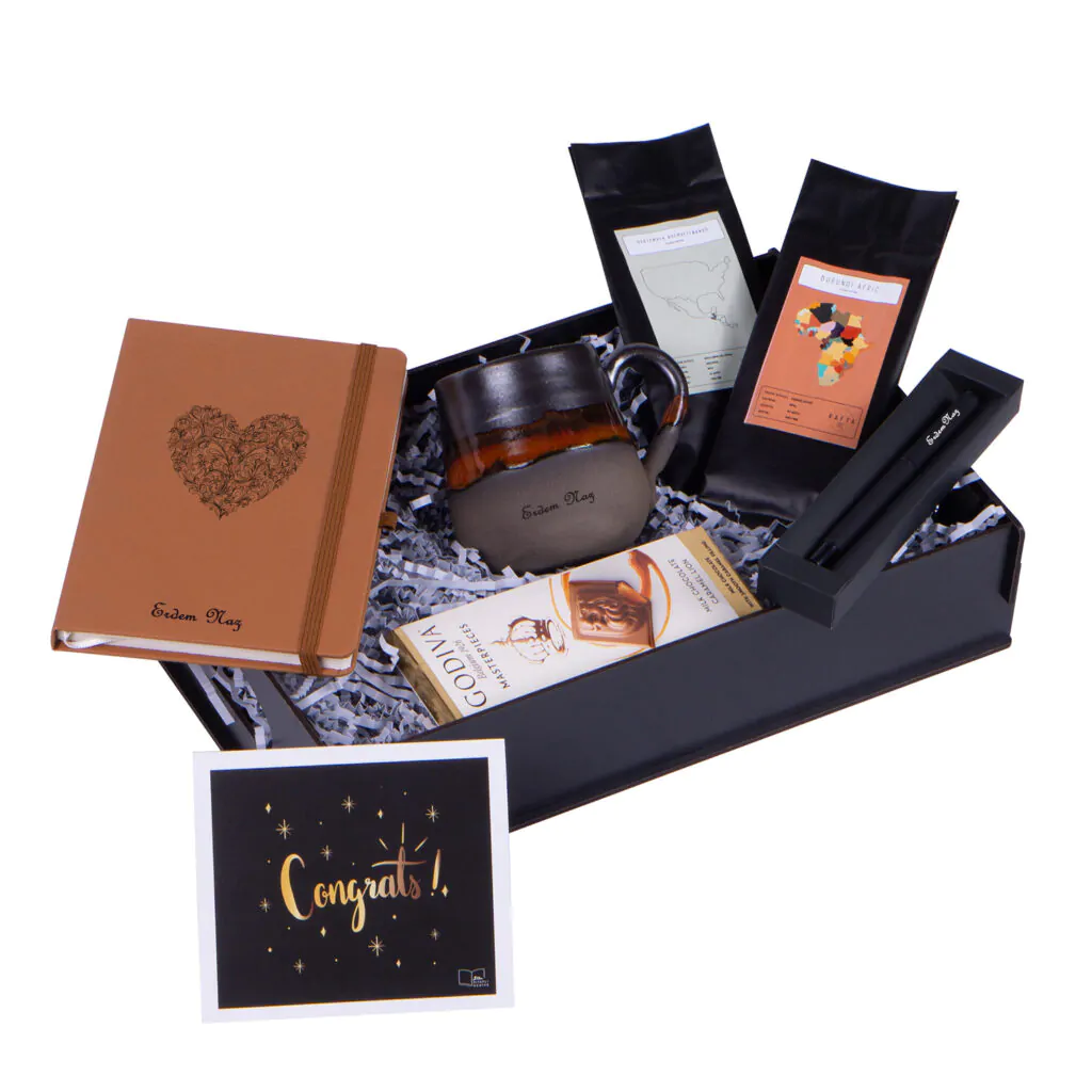 Tercihte bulunabileceğiniz setlerden bir tanesi de eşe doğum günü hediyesi kutusudur. Set içeirğinde el yapımı özel sırlı kupa, eşinizin ismine göre hazırlanan defter, dünya kahvelerinden örnekler, kalem ve çikolata yer alır. Set içeriğinde bulunan çikolata Godiva markasına aittir. Dünya kahveleri örnekleri ise Brundi ve Guatemala bölgelerindendir.