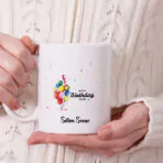 Bu seramik kupa, alıcının ismini taşıyan özel bir tasarıma sahiptir. Doğum günü temasını yansıtan renkli ve neşeli desenlerle süslenmiş olan bu kupa, günlük kahve veya çay ritüellerini daha özel kılar.