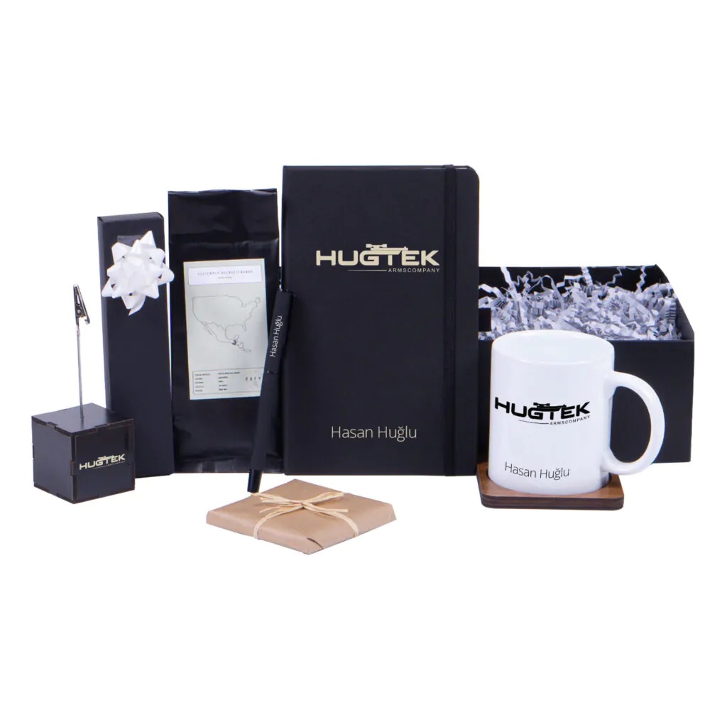 8. Kurum logolu ve isme özel sunulan mat siyah mukavva kutu.